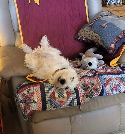 Westie Rescue moved Cody to another foster home to see how he would react to having additional Westies in his home. Off he went to Berryville, VA to hang out with three other Westies at Uncle Lucian's house. There he continued to being a suck up sleeping on a new lap while upside down getting a tummy pet. He wanted to be close and almost wormed his way into being a permanent member of the house hold much to the dismay of other four legged boys who wanted to be number one suck ups.