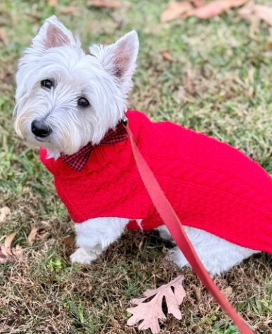 I still don't want to go to a groomer, but Mom has trimmed me up so I'm not quite as scruffy as I was in that first picture that you saw of me on this site. As you can see, I got a beautiful red sweater and a bow tie for Christmas! My parents think I look very handsome.