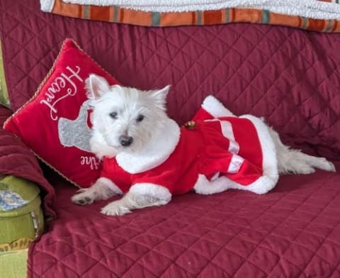 "I also got a new home, a Miss Santa outfit, and a new Mom who thinks I am the smartest and BEST Westie she ever had! I am not too sure that is true but my momma says so so it must be true.