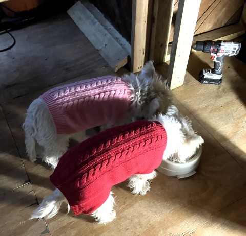 "We got sweaters to keep us warm on the job site!" Tail wags!!