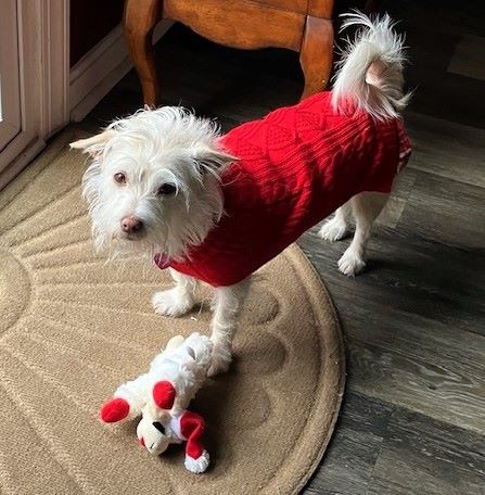 "I got a new sweater to patrol the yard with and a Santa Lamb Chop to chew on!